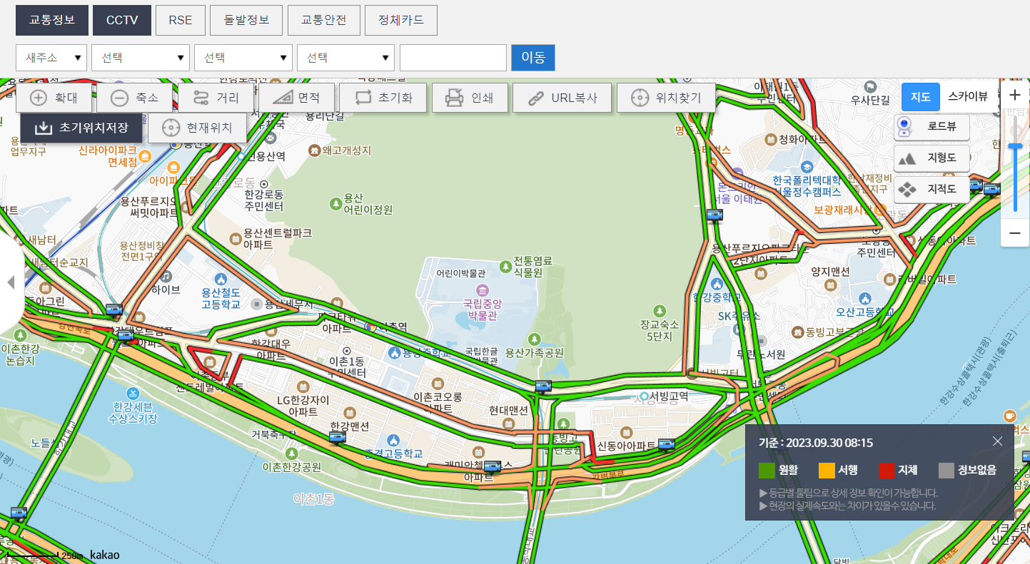 아래 사진과 같이 본인이 확인하길 원하는 지역을 조회하면 고속도로 실시간 교통상황과 마찬가지로 현재 교통흐름을 원활인 경우 초록, 그 외 주황, 빨강 등으로 제공하고 있습니다.