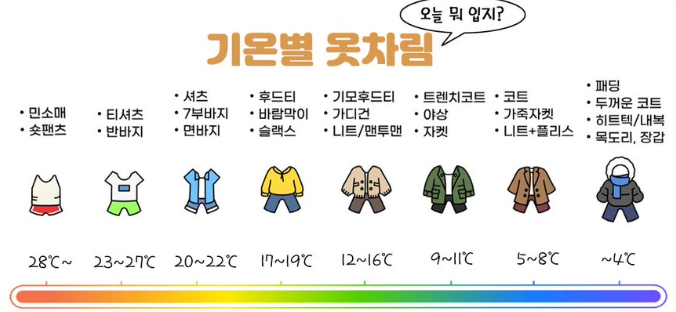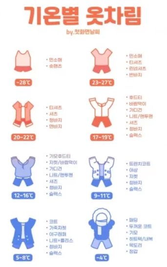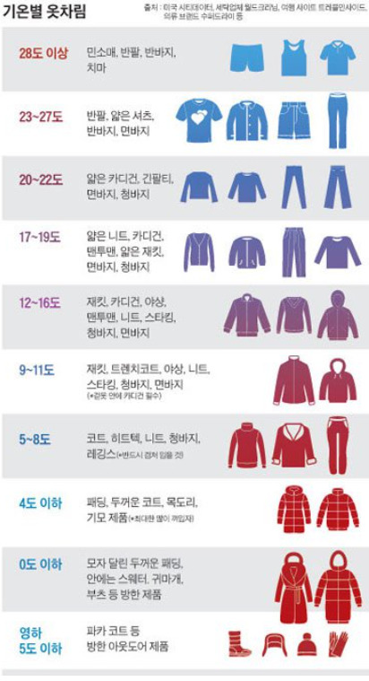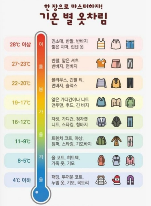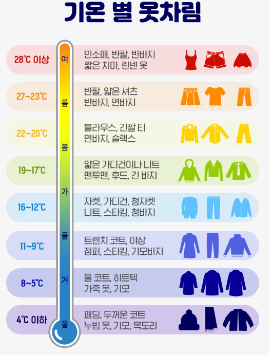 이런 걱정을 이번 글에서 인터넷 등에 있는 계절별, 기온별, 온도별 옷차림 정보를 한 눈에 확인하고 정리할 수 있도록 알려드립니다.