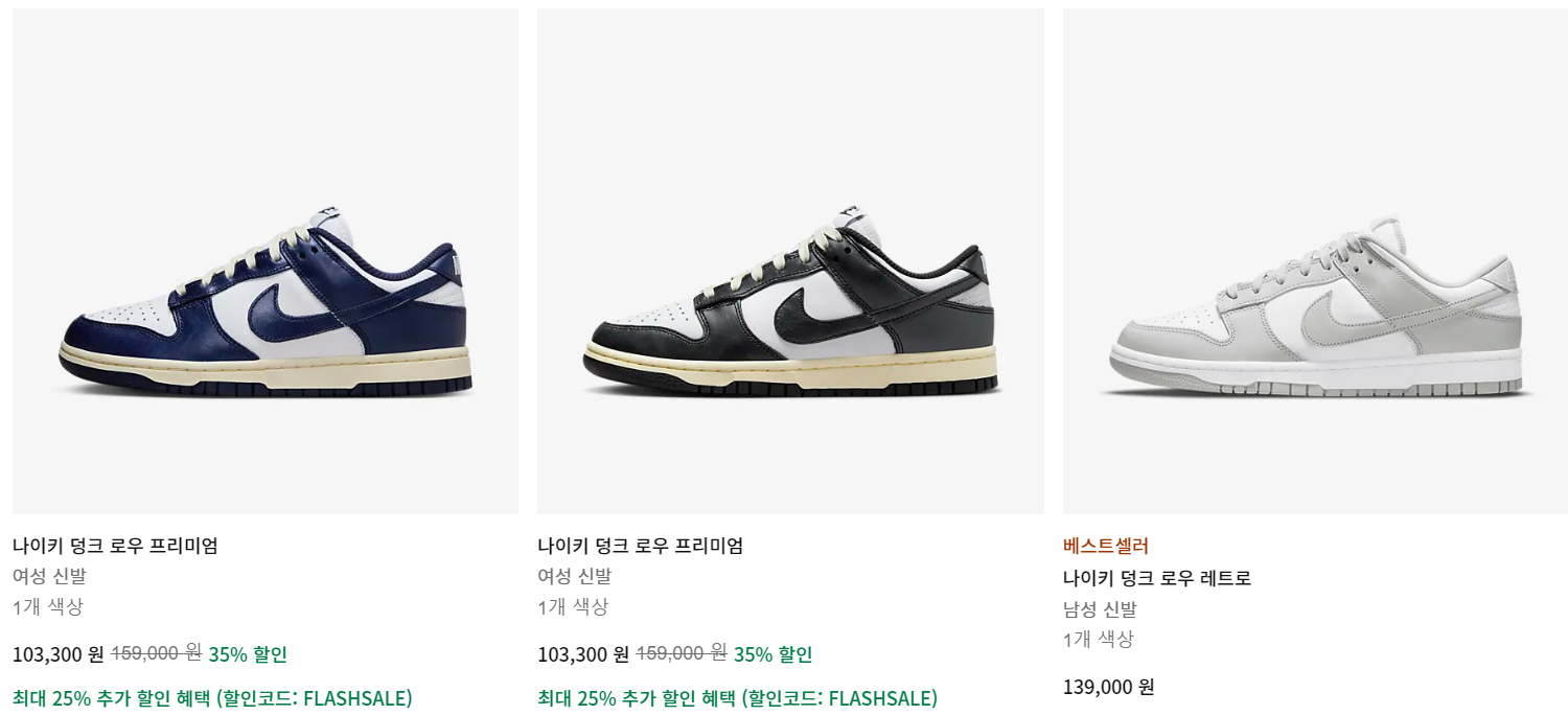 현재 세일하는 제품들 중에서 덩크 로우 프리미엄 제품들이 추가 할인을 받으면 10만원 아래로 살 수 있는 만큼 구매를 원하는 분들은 빠르게 구매하시길 추천드립니다.