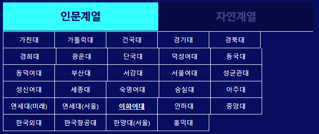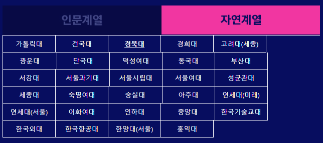 | 대학교 | 인문계열 | 자연계열 |