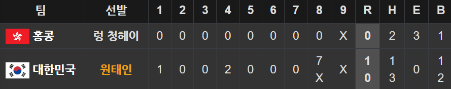 우리나라 선발투수인 원태인은 무실점으로 4이닝 경기를 마쳤으며, 정우영, 최지민, 장현석, 박영현 투수가 연이어 등판하였고, 최지민 투수가 승리투수요건을 갖추어 승리투수가 되었습니다.