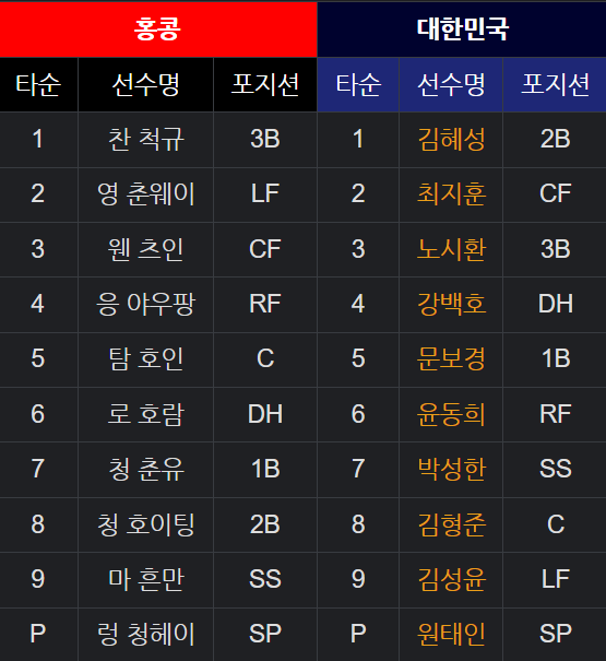홍콩전 선발라인업
