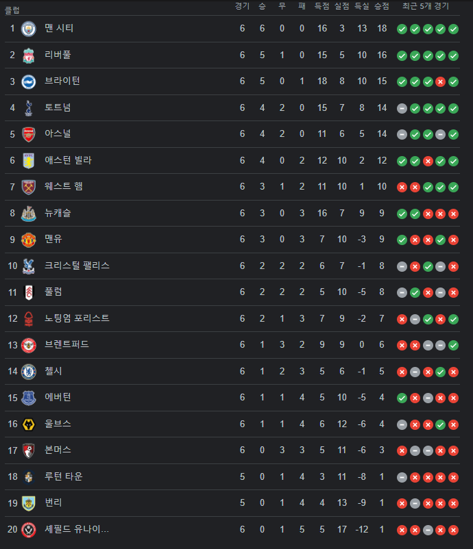 현재 브라이턴과 토트넘, 애스턴 빌라의 선전이 눈에 띄며 특히 토트넘의 경우 케인이 빠진 빈자리를 손흥민 선수가 잘 메꾸고 있는 상황으로 향후 최종 순위 변동에 많은 관심을 받고 있습니다.