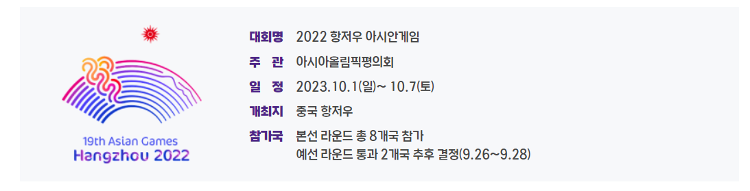 항저우 아시안게임이 2022년 개최예정이었으나, 코로나 등의 이유로 1년 연기되어 2023년인 올해 개최됩니다. 이 대회는 아시아의 모든 구성원이 참여하는 스포츠 축제로 올림픽에 이어 세계에서 두번째로 많은 45개국 11,943명의 사람들이 참여합니다.