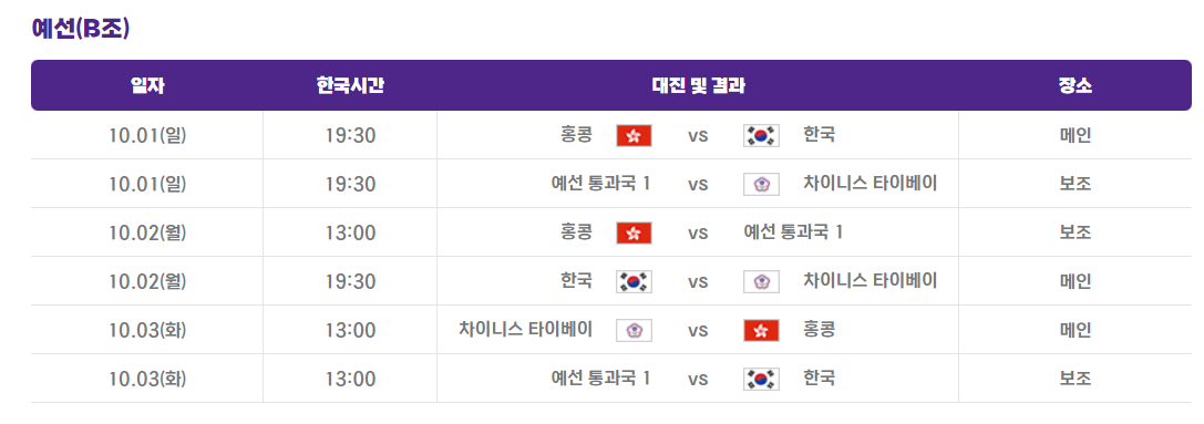 - 4경기(10월2일 18시30분 ,월요일) : 대한민국 VS 대만