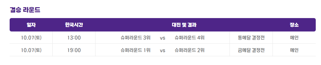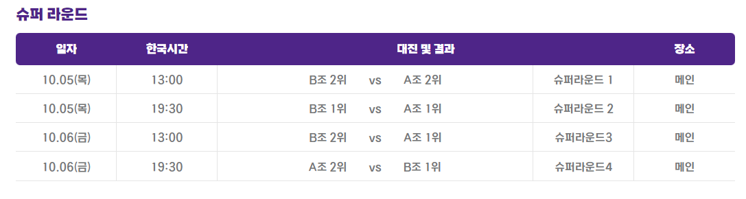 - 3경기(10월6일 12시 ,금요일) : B조2위 VS A조1위