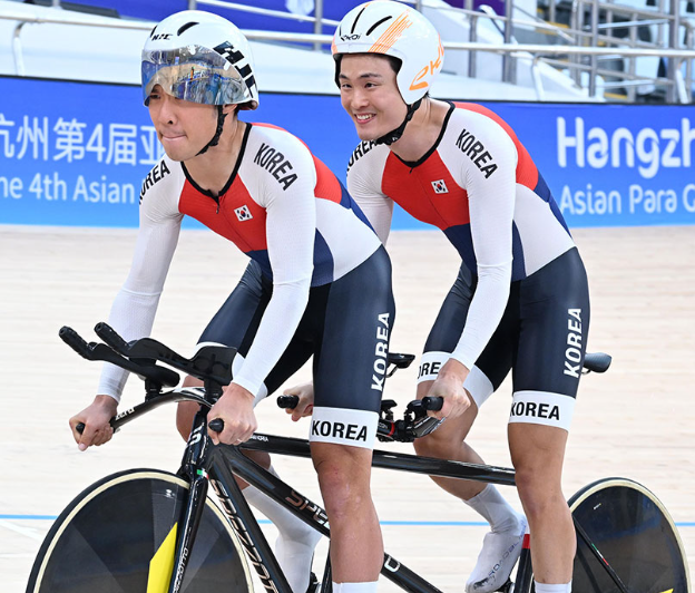 이번 항저우 아시안게임 패러게임에서 대한민국 첫 금메달리스트로 기록된 선수는 사이클 4000m 개인추발에서 우승한 김정빈과 윤중헌 선수입니다. 축하합니다.