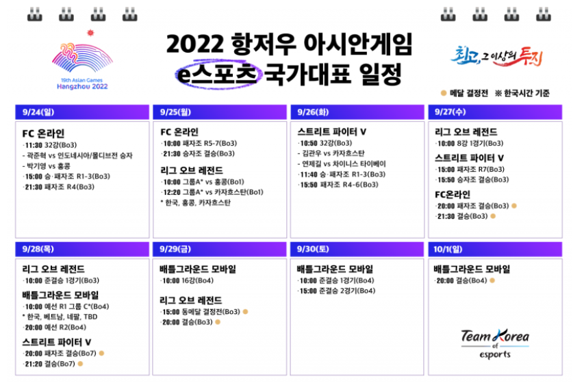 항저우 아시안게임 e스포츠종목은9월24일부터 10월2일까지 진행되며, 종목별로 일정이 다르니, 아래 링크를 통해 정확한 일정을 확인해보시기 바랍니다.
