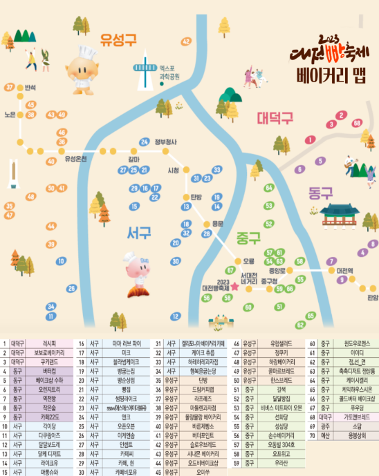 68개의 대전 빵집광주,예산의 빵집 2개가 참여하여 총 70개의 빵집이 행사에 참여합니다.