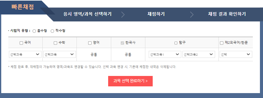 시험지 유형과 선택과목 선택 후 과목선택완료를 누르면 채점할 수 있는 화면으로 이동합니다.