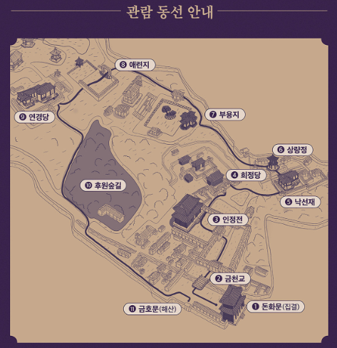 - 돈화문(집결) → 금천교 → 인정전 → 희정당 → 낙선재 → 상량정 → 부용지 → 애련지 → 연경당 → 후원숲길 → 금호문(해산)